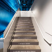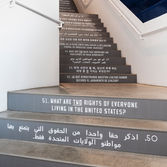 Underscoring how language can act as a barrier to citizenship, Who Was This Built to Protect? places Messages to Authorities (Go Away!) directly in conversation with the U.S. Naturalization Test questions through a selection of U.S. Citizenship Test Samplers (2012-ongoing), needlework samplers of U.S. Naturalization Test questions and answers made by U.S. non-citizens during artist-facilitated workshops. Han Sifuentes repeats these questions on moCa’s Kohl Monumental Staircase, a game of one step forward, two steps back to test civic knowledge and illustrate the often-performative labor non-citizens must endure to prove their worth. An unflinching critique of U.S. governmental practices, Who Was This Built to Protect? highlights roadblocks on the path to citizenship and encourages audiences to question bureaucratic systems, those who constructed the systems, and for whom the systems are designed to benefit.